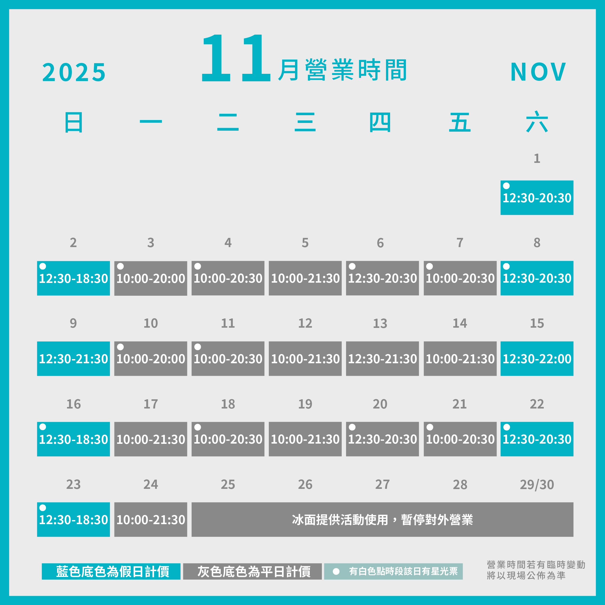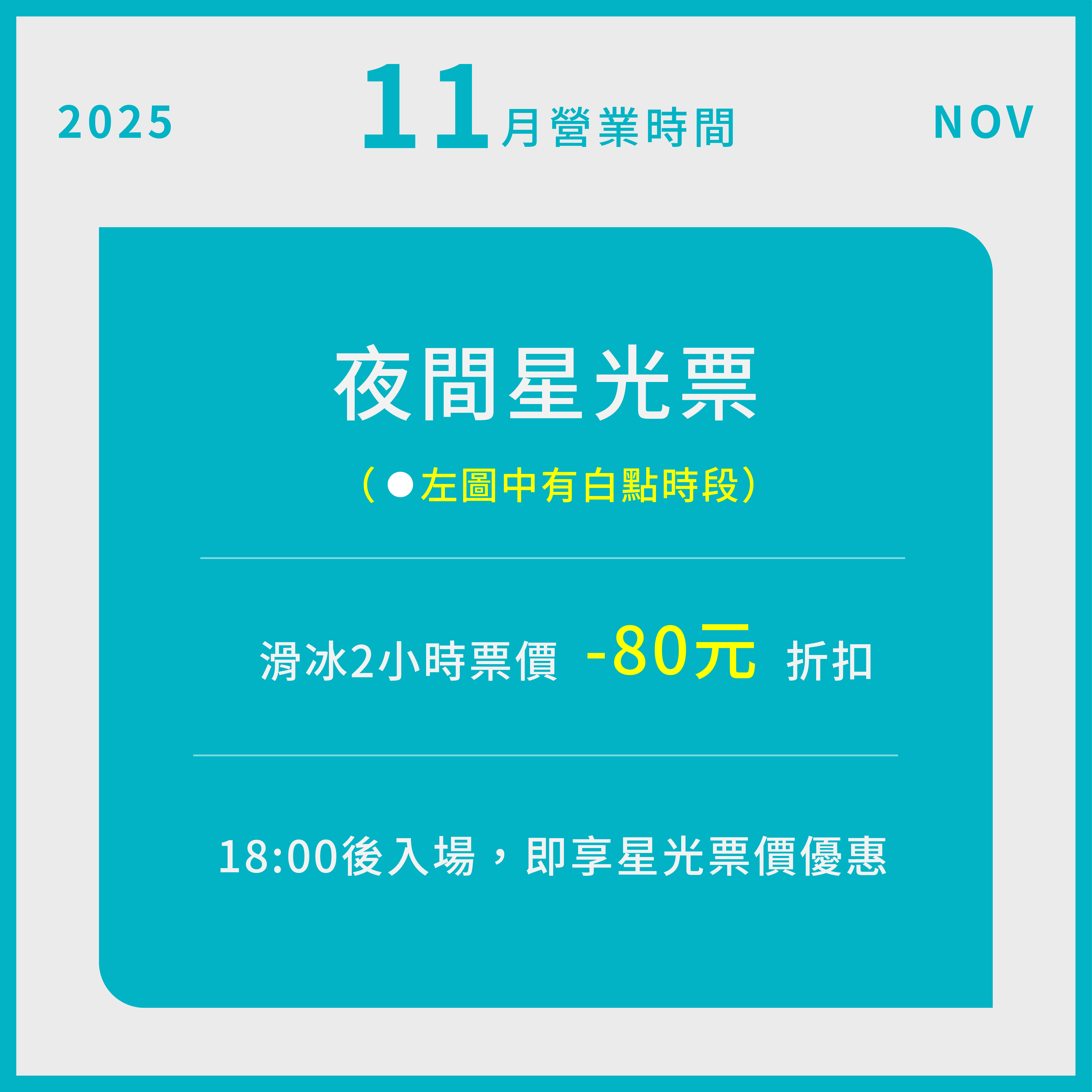 當日營業時段,若顯示「白點」,則當日若於18:00後入場,即享星光票優惠(滑冰2小時票-80元折扣)